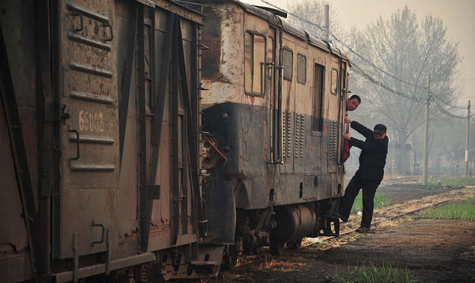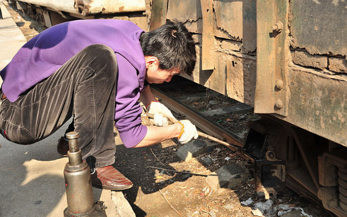 36.在这火车迟迟不走了——原来车头的轴发热漏油了!于是技师开始修车。这小火车常常就是这样,没有谁抱怨,没有谁惊奇。