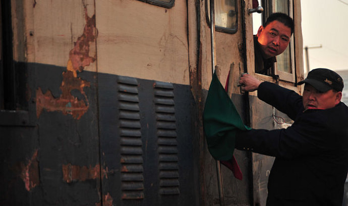 46.老师傅一声大喊,信号旗一挥,列车许许再次出发了。