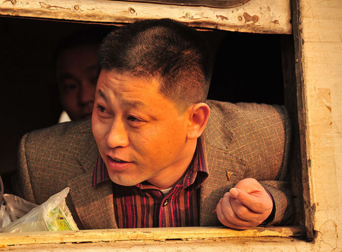 49.又一站,人下了很多,挂车又空了。让我很感动的是,这位农民兄弟,把自己的一件衣服垫在石头上,请我坐下,我谢了,说喜欢站站。