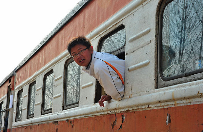 42.因为车迟迟没有修好,这位小兄弟很好奇,探身窥视。他说他也是第一次坐这小火车。