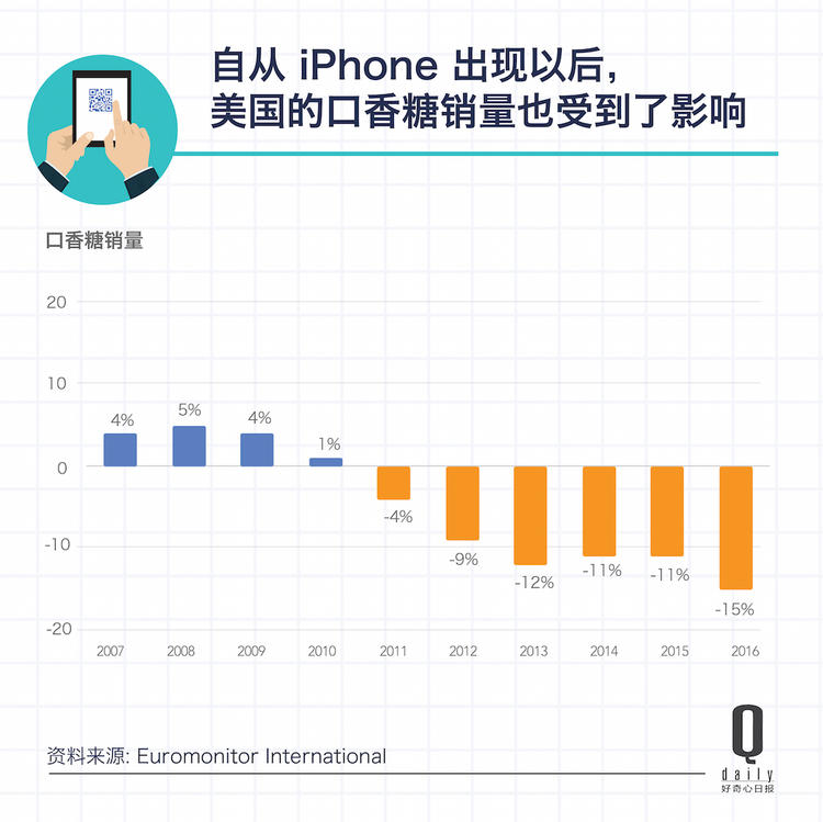这些改变,除了玩手机带来的更少睡眠、性生活变少之外,一些跟智能手机本来没什么关系的行业也受到了影响……例如,口香糖。