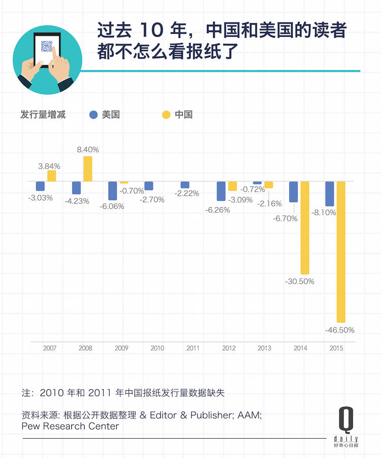 美国的日报的销售虽然从 2003 年就开始连续下滑,但是从 2007 年开始这个下滑速度变得更快了。而在中国,从 2009 年开始,报纸的销量也开始了下滑,到 2015 年这个下滑率已经达到了近 50%。