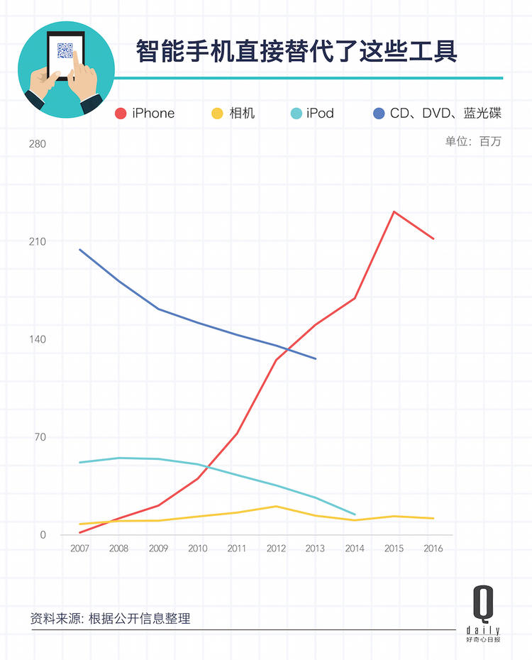 曾经人们专门用来听歌的 MP3 也不再被人们需要了。一个明显的例子是 ipod,2009 年之后它的销量就开始下滑,到 2015 年苹果已经不再单独公布它的销售数字了。