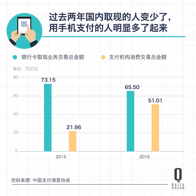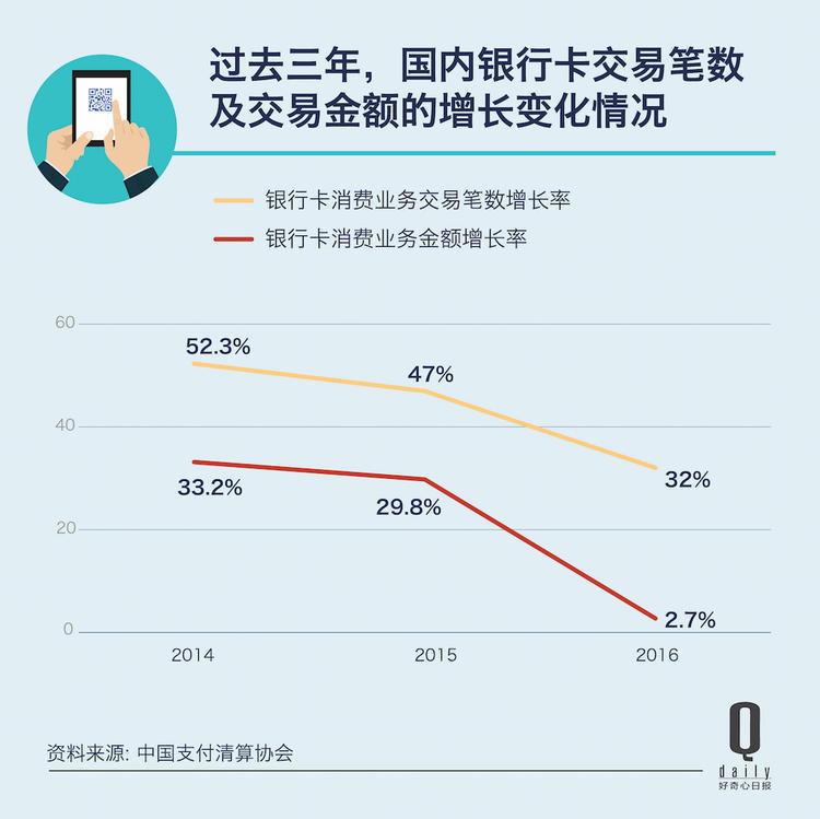今年 5 月,中国清算支付协会数据显示,过去三年用现金的人变少了。2016 年中国取现业务的交易金额同比下滑 10.46%。尽管其中有部分原因是国内经济疲软,但是过去一年人们的消费频次仍在增长,只是刷卡的人变少了。