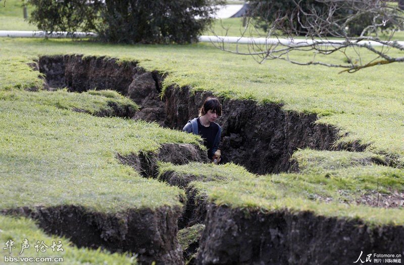 2010年9月9日,新西兰,凯厄波伊:一个人在地震后的大裂缝上行走。凯厄波伊是靠近克赖斯特彻其的一个城市,9月4日,曾遭遇了7.1级的地震,粉碎了房屋,撕裂了公路,扭坏了铁轨。