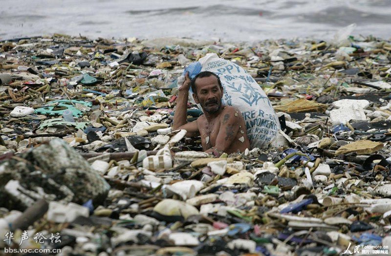 2010年8月8日,菲律宾,马尼拉:一名男子在冲到岸上的垃圾中寻找塑料品和铝制罐