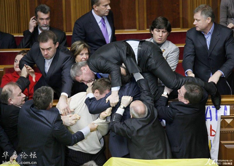 2010年4月27日,乌克兰,基辅:乌克兰反对派和亲总统派的立法者在议会上商议俄罗斯黑海舰队议题时互相厮打起来