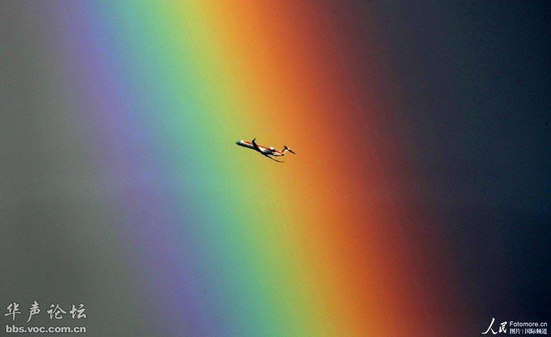 2010年8月5日,法国,Nice:法国东南部的地中海上空呈现出巨大彩虹。一架飞机从彩虹前飞过