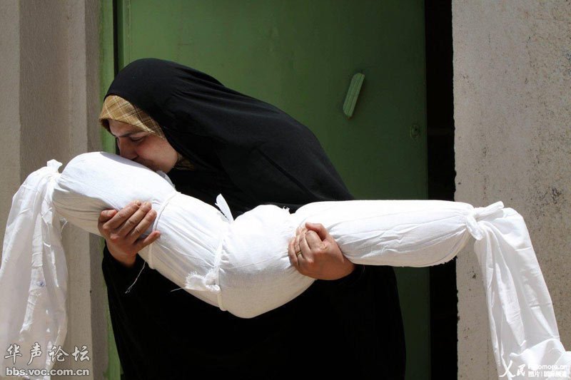 2010年6月21日,伊拉克,纳贾夫:一名女子亲吻她四岁侄女Zainab的尸体。巴格达商业区发生自杀性爆炸,Zainab的全家被杀