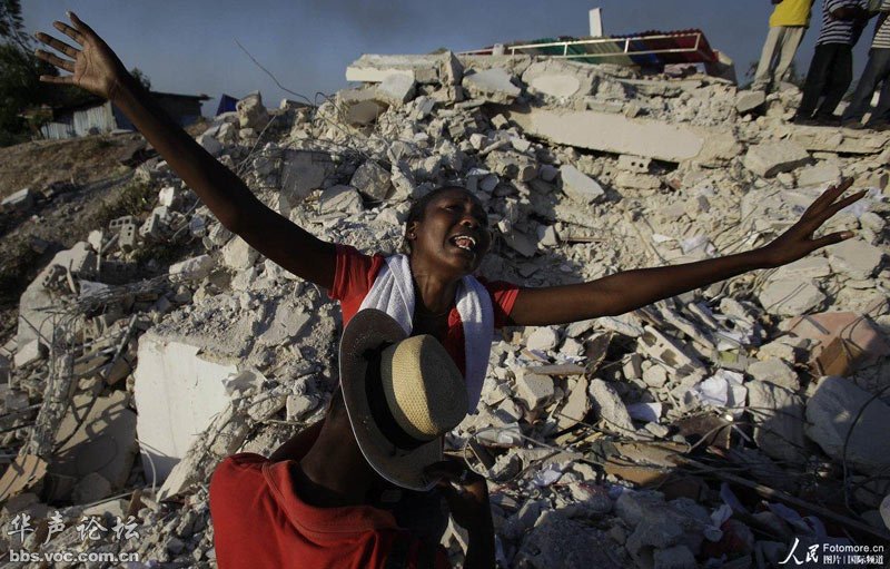 2010年1月18日,海地,太子港:一名女子跪地向上帝祈祷,她的妹妹从废墟中成功被救出