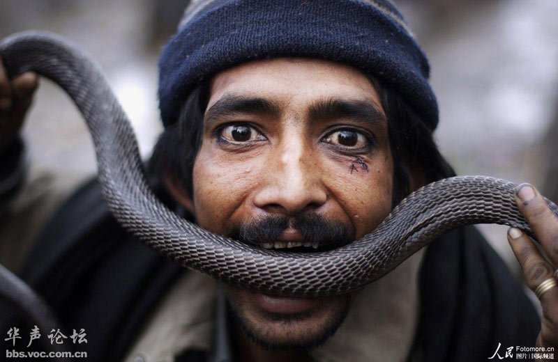 2010年2月24日,巴基斯坦,伊斯兰堡:一名男子拿蛇表演绝技来赚钱