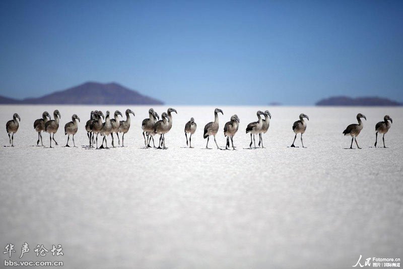 2010年7月28日,玻利维亚,乌尤尼盐沼:智利火烈雏鸟在沼泽中徘徊。可能由于极端寒冷的天气和严重干旱,火烈鸟遗弃幼鸟。饥饿、迷路和虚弱使得它们飞不起来也不能保护自己,而被冻死或被车轧死。