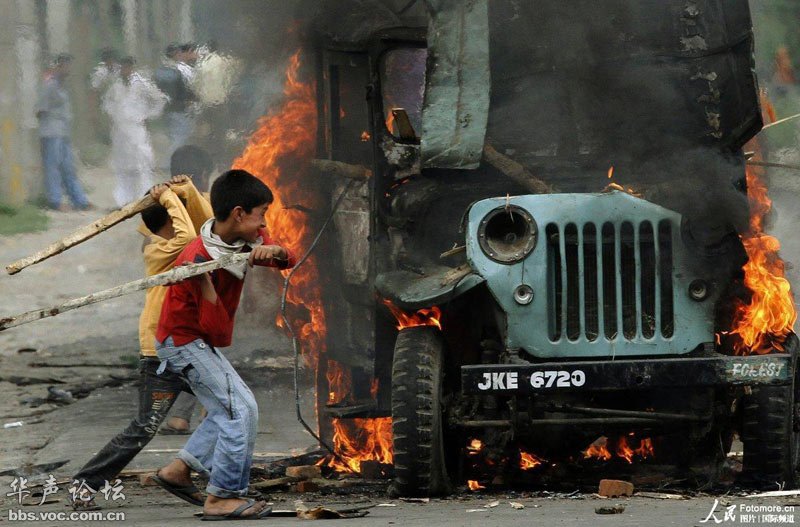 2010年8月4日,印度,斯利那加:克什米尔儿童点着了一辆政府车。印控克什米尔地区出现警民冲突