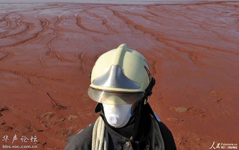 2010年10月10日,匈牙利,代韦切尔:一名匈牙利消防员戴着防毒面具和外衣在被有毒废水威胁的水库附近执行守卫任务
