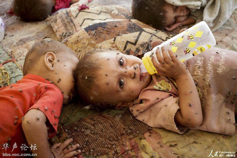 2010年8月31日,巴基斯坦,瑙谢拉:在巴基斯坦洪灾中幸存的儿童生活环境十分恶劣,脸上爬满了苍蝇