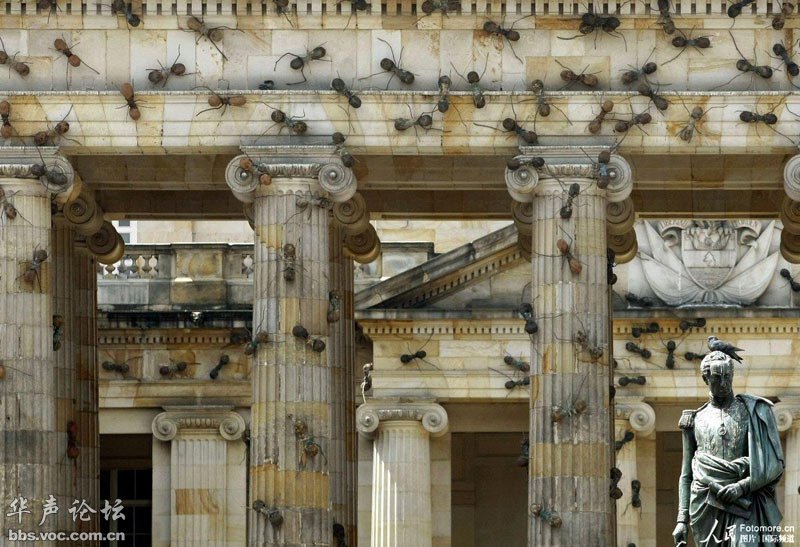 2010年2月16日,哥伦比亚,波哥大:哥伦比亚的艺术家拉斐尔·戈麦斯·巴罗斯的作品《蚂蚁》被摆放在了全国代表大会的门廊上。这个作品意为哥伦比亚持续不断的武装冲突。
