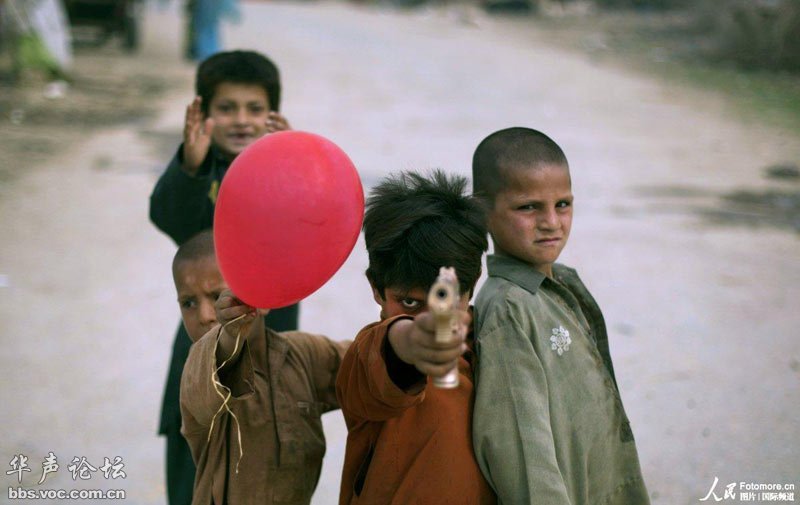 2010年3月21日,巴基斯坦,拉瓦尔品第:一名阿富汗难民男孩用他的玩具枪指着摄影师。