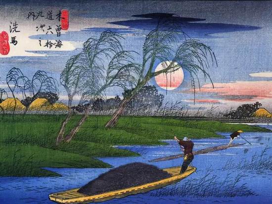 34岁上,已经投入歌川派,成为歌川广重的歌川广重,发布了《东海道五十三次》,成为一代传奇。那时赶上江户居民旅行高峰,大家都喜欢看他这条江户出发、东海道到京都的风景系列。他过世在1858年,那年梵高5岁。