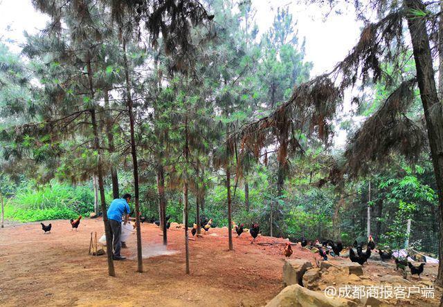 唐冬家屋后的整座山,都是他的农场。山上林间黑色、斑点色的鸡一见人走来,四处飞散。