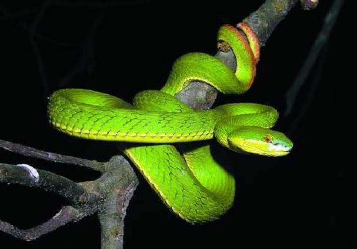4.竹叶青:喜欢吊在树枝上,农村瓜棚杂草堆也常见,剧毒,被咬到伤口会非常痛苦