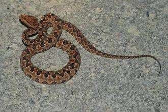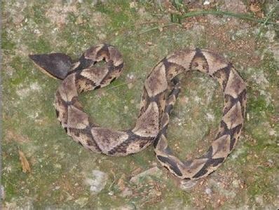 5.短尾蝮:头呈三角形,身短,,头上有两条明显的白色眉毛,剧毒