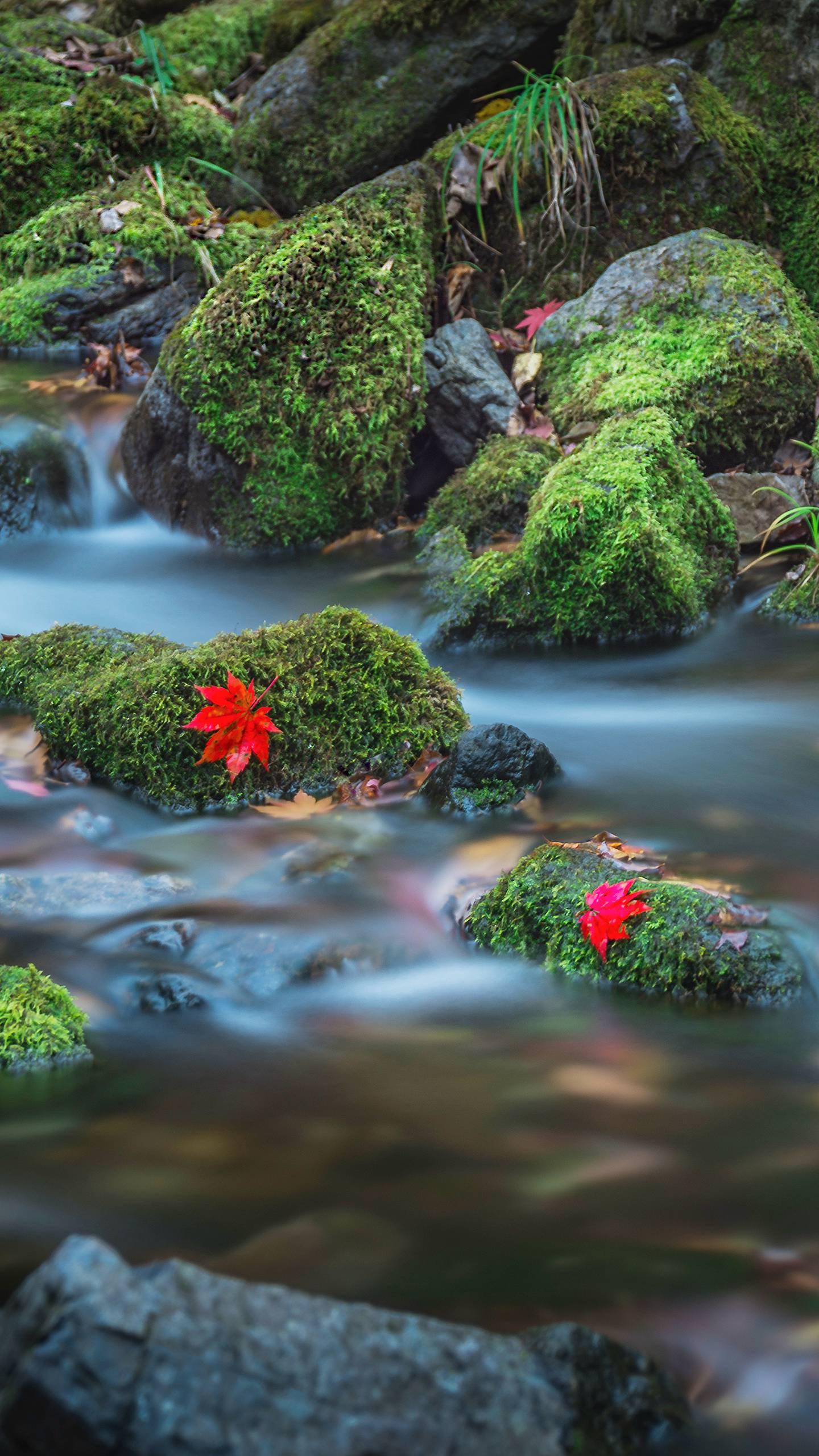 潺潺小溪如奶油般丝滑柔顺,两片红叶落在长满苔藓的岩石上,点缀着唯美的画面。
