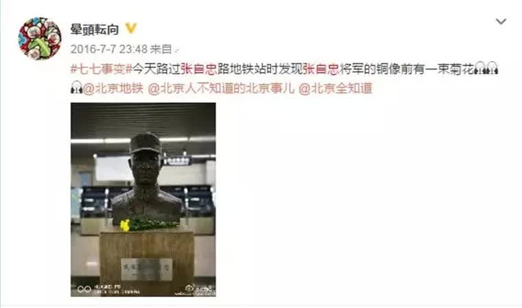 第二个故事,2016年7月7日,北京的一位网友路过张自忠路地铁站的时候,看到将军铜像前有一束菊花。