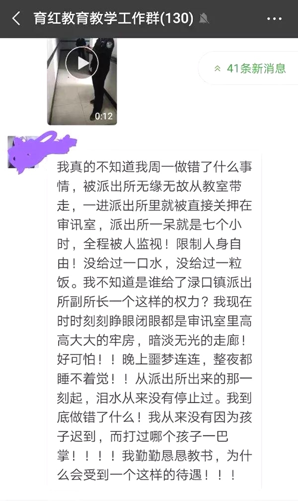 被带离的何姓女教师在离开派出所后在微信工作群里感叹:“我不知道谁给了派出所副所长一个这样的权力?……我到底做错了什么!我从来没有因为孩子迟到而打过哪个孩子一巴掌!我勤勤恳恳教书,为什么会受到一个这样的待遇。”