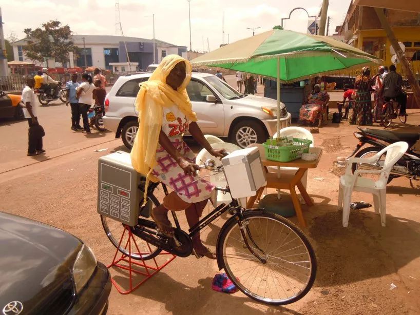 △ 乌干达,这个叫 Zelia 的妇女在试骑充电车,车后的箱子里装着一块太阳能蓄电池,每次充满能坚持 3 天,每天能充 30 - 50 部手机(图源:buffalo grid)
