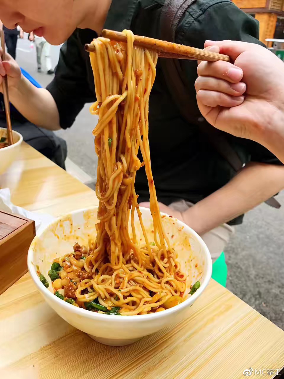 我也参与其中,端过了一个白色的面碗,将滑韧弹牙的碱水面条吸入嘴中,我想细细品尝,却控制不住狼吞虎咽,就像猪八戒吃人参果一样把整碗面给囫囵吞下。一个字,香,两个字,好吃。三个字,太好吃。四个字,我日你哥。