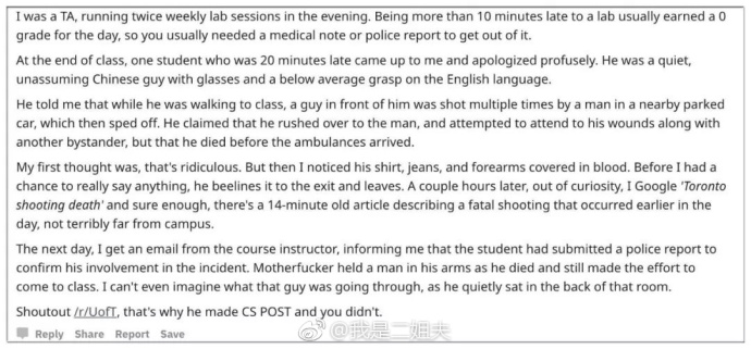 【(转发)因为枪击案上课迟到】近日,外国社交网站Reddit上一个帖子火了。准确的说火的不是这个帖子,而是其中的一条回复。