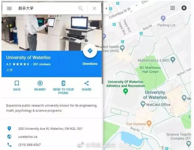 加拿大的滑铁卢大学,被戏称为“自杀大学”。搜索“自杀大学”,跳出滑铁卢大学的地址,英文搜索也是同样的结果。【图二】