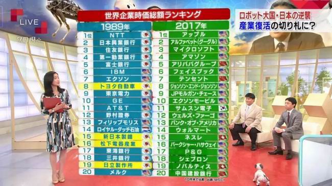 NHK盘点1989年,日本泡沫经济的巅峰时,全球市值最高的前20位公司中,日本企业占了13席。