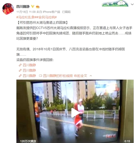 但在还剩最后500米时,一名赛事志愿者想为何引丽递上国旗,但何引丽根本顾不上去拿,志愿者在身后追了100米后,最终放弃。随后还有一名跑上来送国旗,最后何引丽只顾着拿惨遭反超,随后扔掉国旗也没能追上。这件事引起热议。