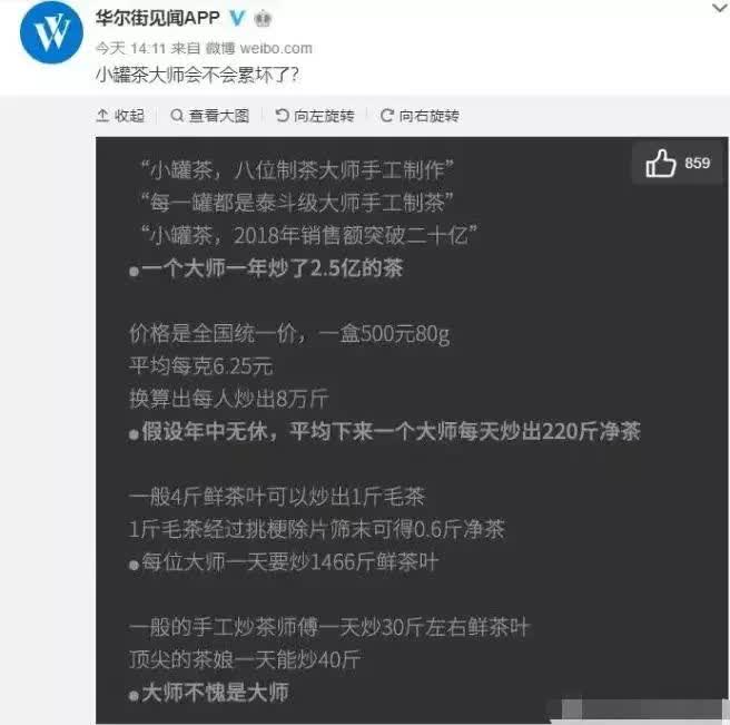 前两天,有人给“8位大师手工制作”的小罐茶算了一笔账,按照杜国楹的宣传词,一位大师每天要炒1400斤茶叶,大师不愧是大师!