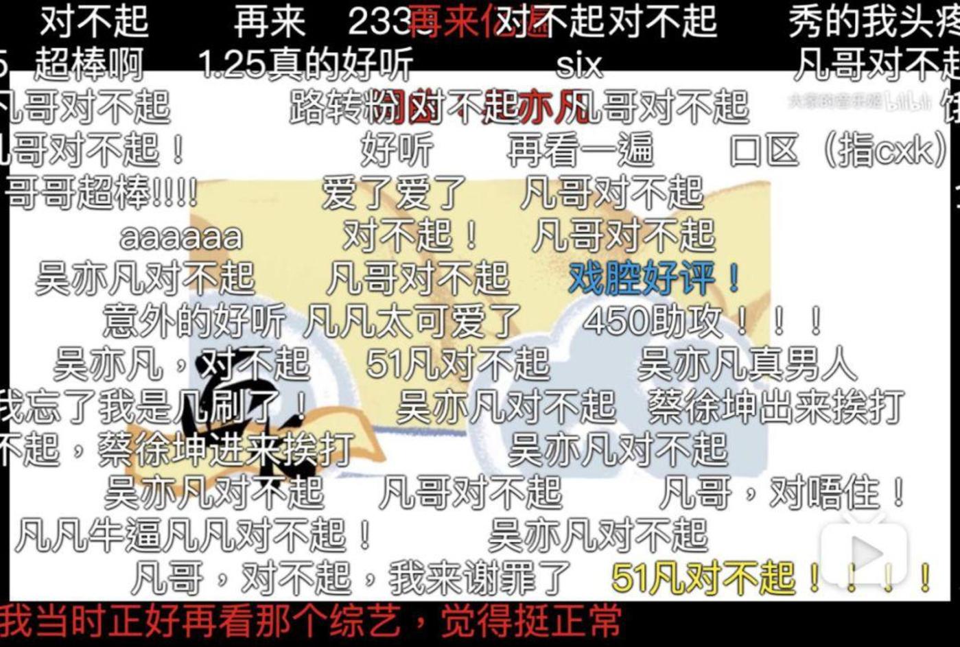 B站用户一句句“吴亦凡,对不起”的弹幕表达此前的恶搞歉意,虎扑JRS则用“此前有个吴亦凡我们没珍惜,直到现在出来个蔡徐坤我才追悔莫及”来表明当下的立场。