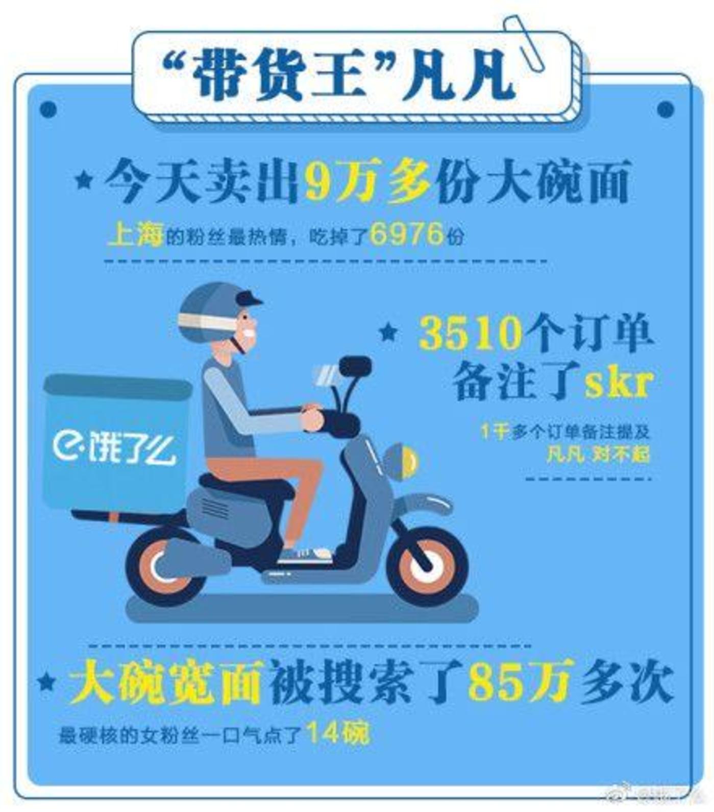 据饿了么数据显示,新歌发布当天,大碗宽面卖出9万多碗,搜索超过85万。今年以来,备注中提及skr的订单量更是超过3000多条。与其以往所设立的高端人设以及带货高奢品相比,这波平民化带货和无偶像架子的公关,可谓是娱乐圈营销的新晋案例。