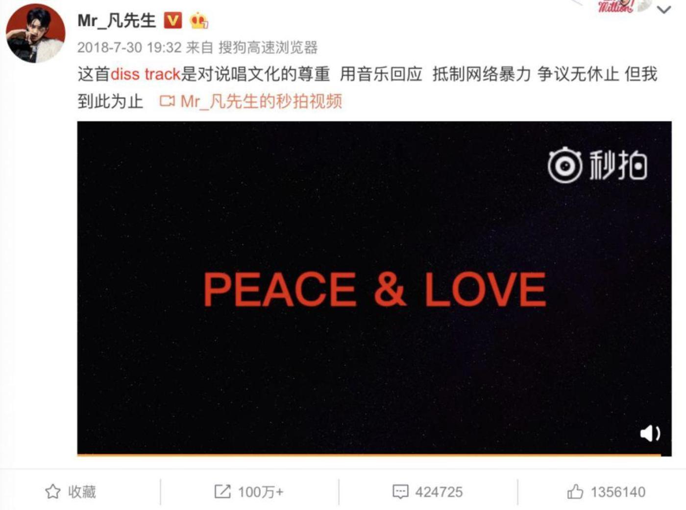 “这首diss track是对说唱文化的尊重,用音乐回应,抵制网络暴力,争议无休止,但我到此为止”。2018年7月,因一则diss微博,吴亦凡成功出圈,但代价却是虎扑步行街群嘲贴的“可绕地球一圈”。