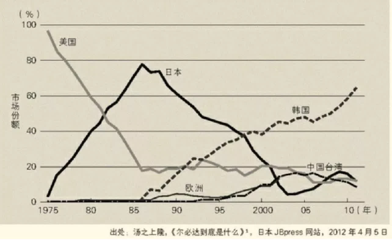 这一战,日本人输得干干净净,从高峰时占据全球近80%的DRAM(俗称电脑内存)份额,跌到现在的零。这场芯片战争完美诠释了什么叫国际政治经济学,亚当.斯密的自由市场竞争理论在大国产业PK中,只是一个美好的童话。