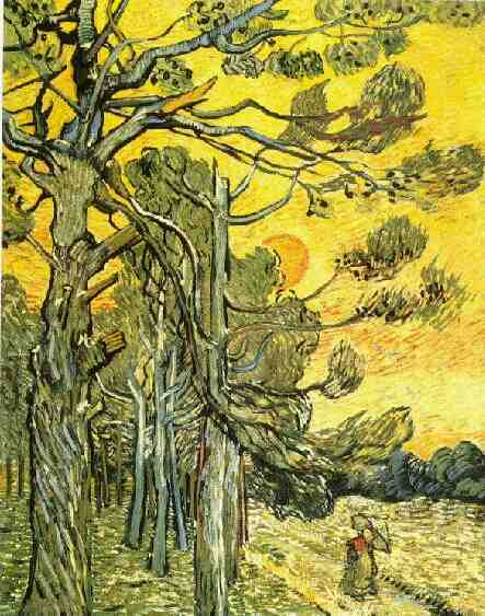 这幅画上,前景画了一位妇女撑着伞行走,柠檬黄的天空,落日的余晖使松林的阴影浮现出来.挺拔耸立的树干与在强风中飘舞的松枝,交织出一种非常紧密的感觉.