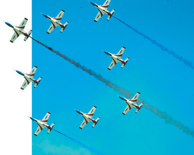 【现场】5架教—8飞机呈楔队飞过,突然同时快速滚转,速度、高度和动作的控制恰到好处,一气呵成。随后,5架飞机保持密集队形,像一簇整齐的离弦之箭,射向苍穹,在1300米的高度越过筋斗顶点,拖着彩色烟带绘出一个完美的椭圆形。斜筋斗、水平快速滚转1080度、双机同步滚转转向、僚机绕轴滚转……眼花缭乱的高难度动作,让观众连呼过瘾。