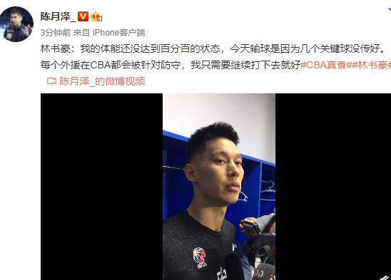 赛后接受采访时,林书豪表示:我的体能还没达到百分百的状态,今天输球是因为几个关键球没传好。