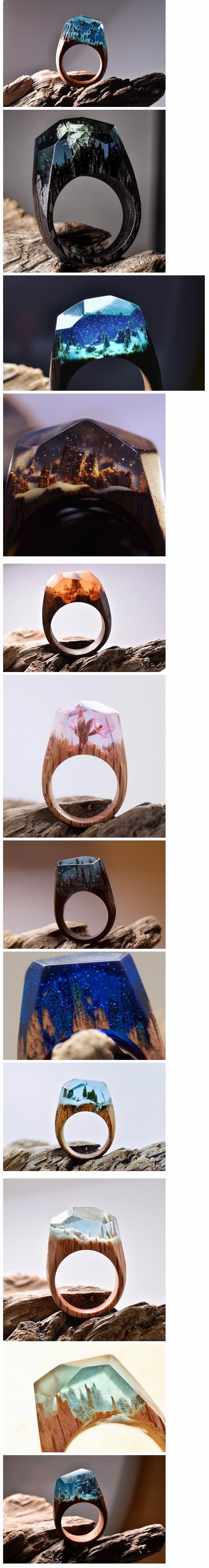 由Secret Wood制作的手工戒指中有着一个精致美丽的世界。戒指由新鲜的木头、树脂和蜂蜡制成,加拿大珠宝商将微弱景观封印再透明材料中。这些立体的微缩景观一般都是些需要探索的地带,比如岩石泻湖、魔法森林、令人惊叹的瀑布。树脂的棱角又很好地突出了景观的层次,只有旋转整个戒指你才能看到全面的景色。