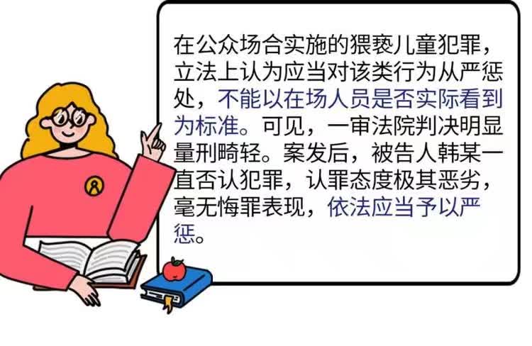 原来,一审法院判决认为韩某在公共场所猥亵幼女,酌情从重处罚,但他的行为具有隐蔽性,不宜认定为“当众”。宝安区人民检察院却认为该判决认定事实错误,适用法律错误,量刑畸轻 。