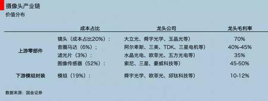 3..最下游的镜头模组组装,是个雇佣大批的人来封装镜头、芯片等零件的苦力活。虽然市场与镜头相当,但利润率只有镜头的1/5而已。
