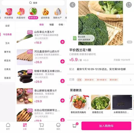 并且在北京的不同区域,配送情况也略有不同,电商在线分别将地址定位在南五环附近社区和东三环附近,前者显示只能第二天配送并且只有根茎类蔬菜,后者则能够实现青菜2小时内送达。