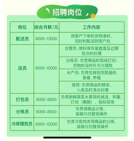 电商在线发现,打开叮咚买菜app,就直接在首焦位置挂上了招聘链接,主要招聘岗位就是配送员、打包员、分拣员、冷库处理员等基础岗位。