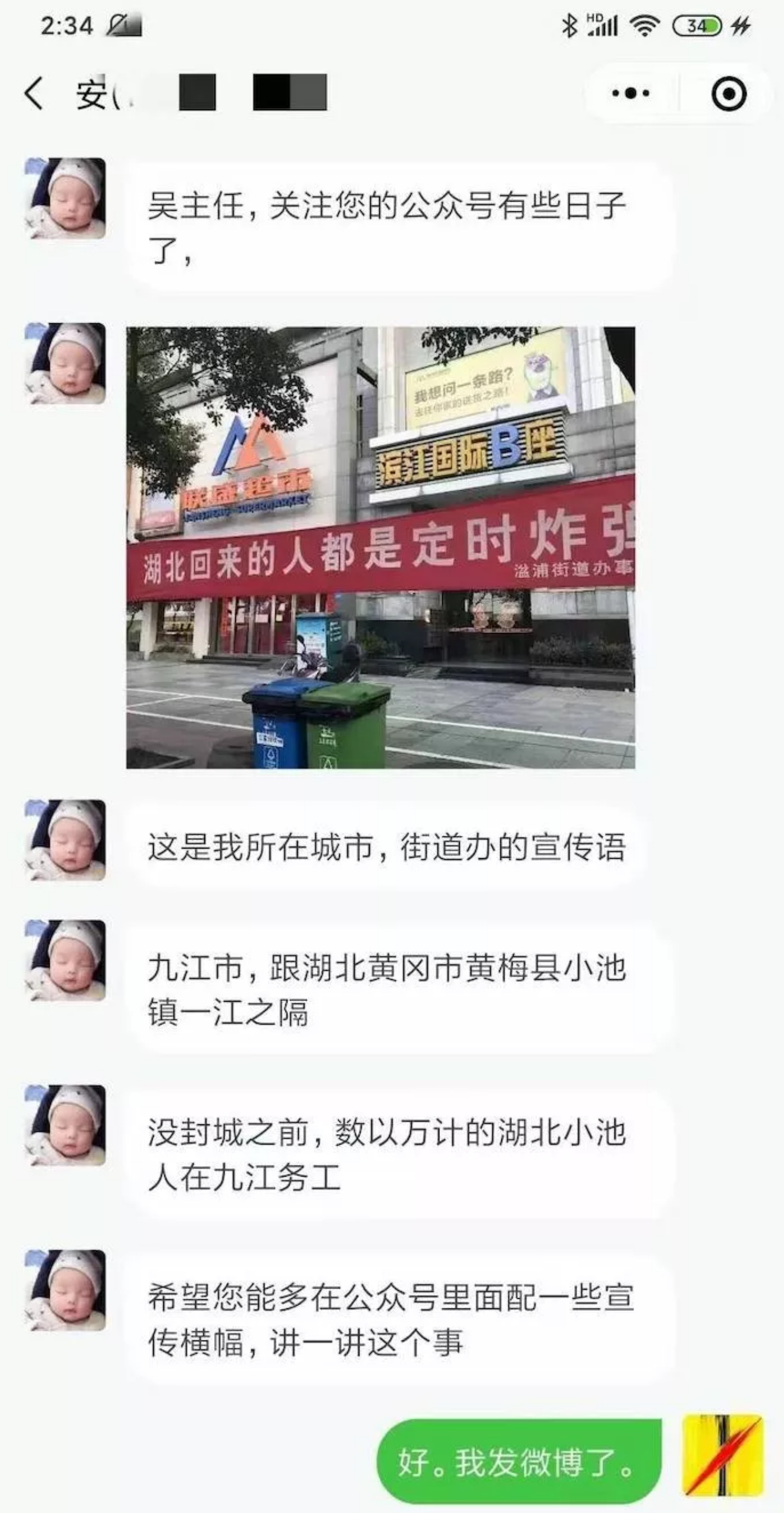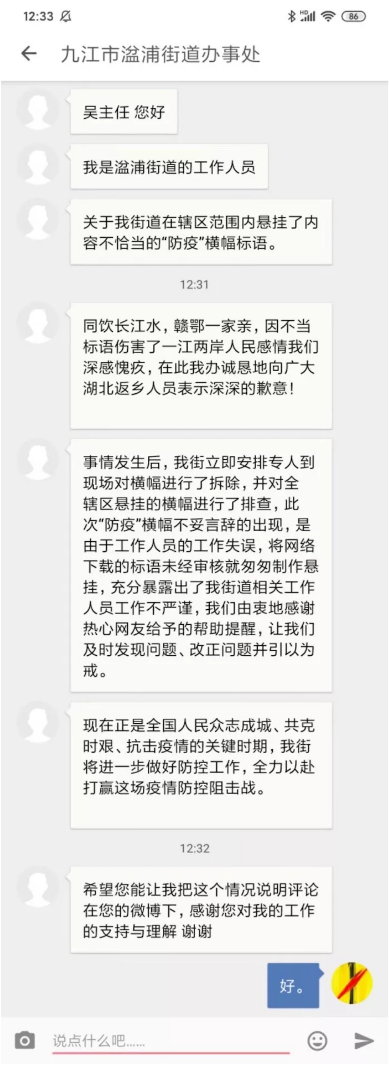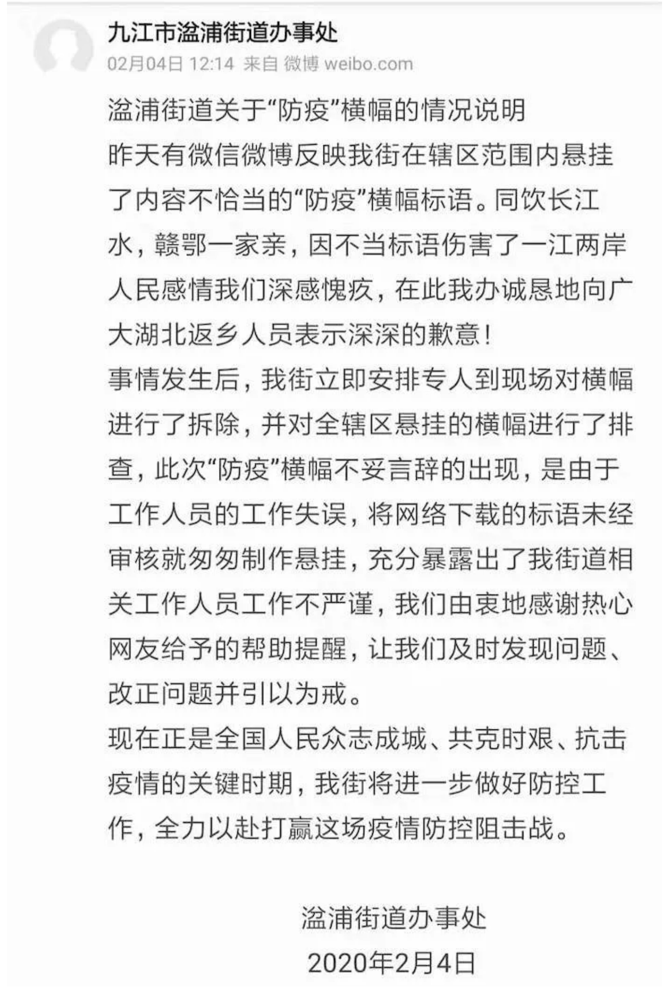 我也要替湓浦街道办说几句话,那个标语是挺恶劣的。但正如你们上面看到的,这是一次工作疏忽。湓浦街道办的人反应迅速态度诚恳,我完全相信他们真的并无恶意。请生活在九江的湖北人们安心。