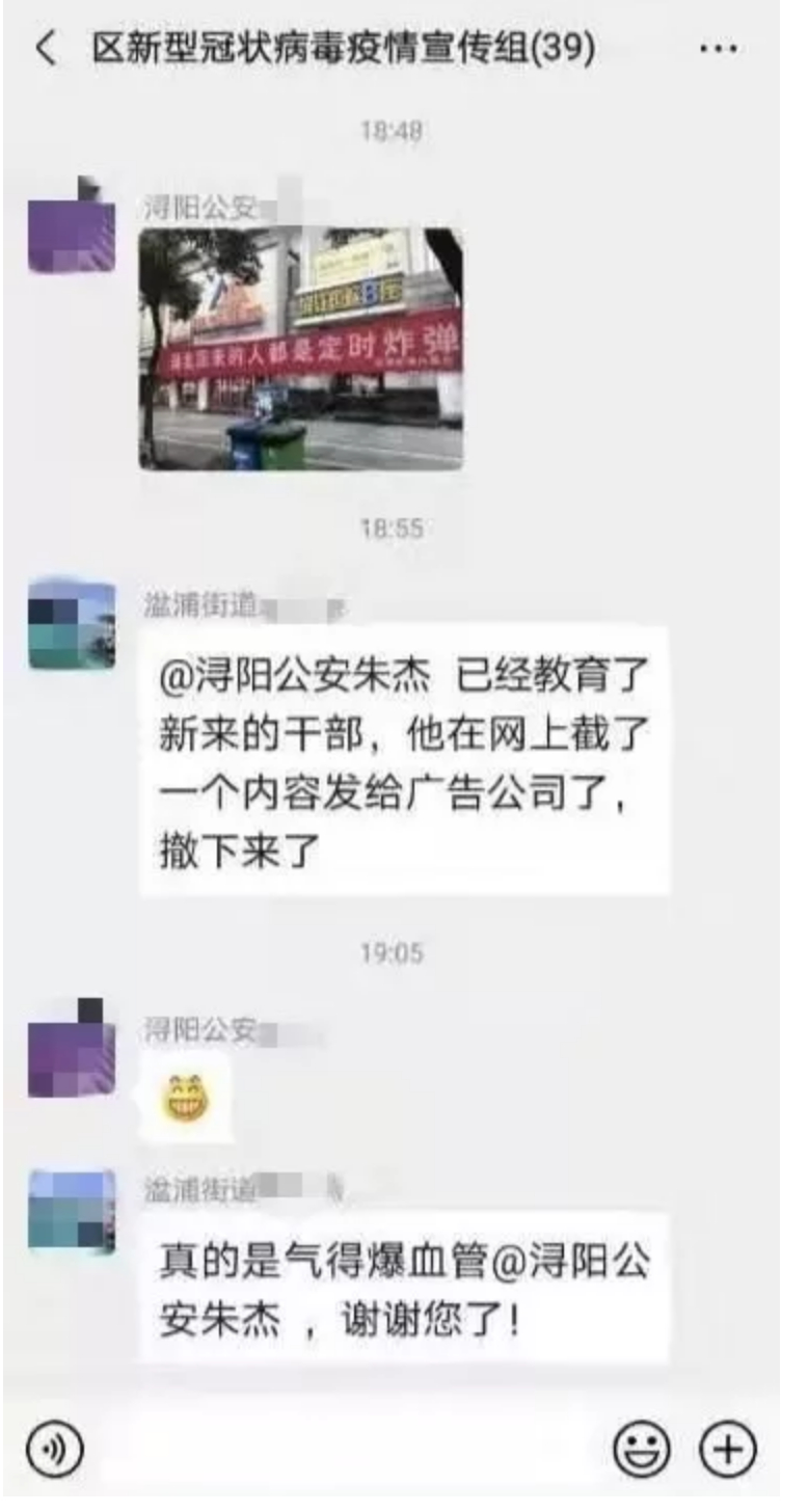 其实湓浦街道和当地派出所民警的聊天截图出来,这件事就结束了。基本上不必怀疑这个标语的真实性。当然挡不住很多人依然在质疑。严谨地说,理论上那聊天记录当然也可能是假的,虽然概率很低很低。