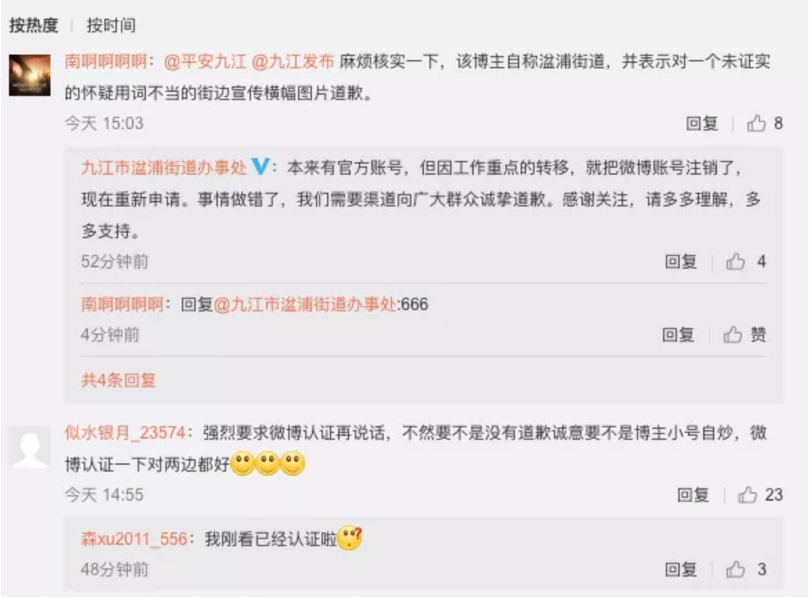 如果,如果不存在这回事,也就是说湓浦街道办的人出来严正声明,我们从未做过这个横幅呢。我的处境当然就很尴尬,可能受到的惩罚上面已经说了,微博官方要么删帖要么标注为不实信息,最严重的就把我号给注销了。这就是我发这张图面临的风险。而我自己觉得可能受到伤害的是我本人的公信力。